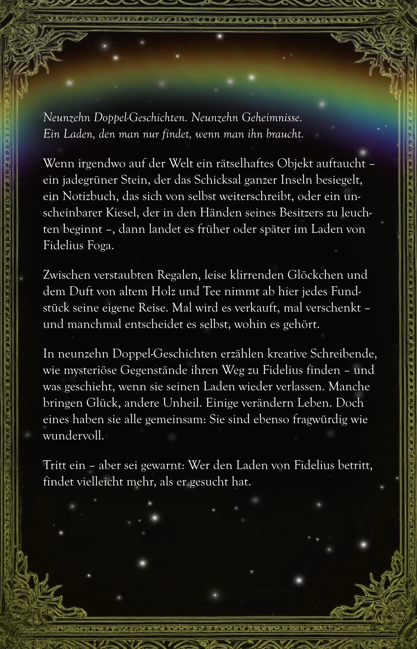 In neunzehn Doppel-Geschichten erzählen kreative Schreibende, wie mysteriöse Gegenstände ihren Weg zu Fidelius finden – und was geschieht, wenn sie seinen Laden wieder verlassen. Manche bringen Glück, andere Unheil. Einige verändern Leben. Doch